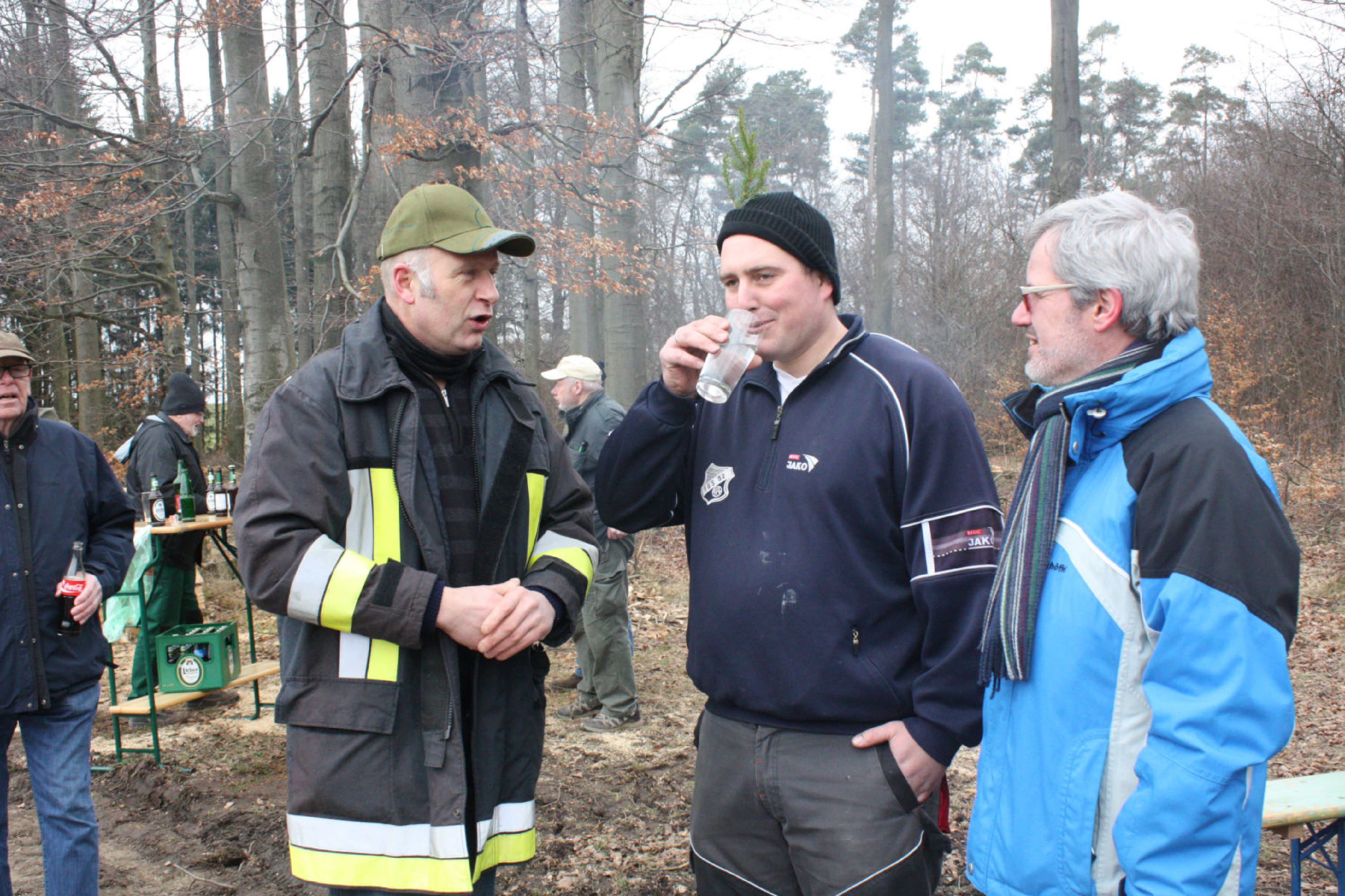 Zur alljährlichen Holzversteigerung trafen sich in diesem Jahr erneut zahlreiche Lardenbacher an der Feuerstelle in der Heidstruth. Begrüßen konnte Ortsvorsteher Jürgen Hofmann auch Grünbergs Bürgermeister Frank Ide und die Stadträte Karlheinz Erdmann und Hans Pigors. Zur Versteigerung standen diesmal 21 Raummeter Buchenholz. Dieses war eine Woche zuvor von Mitgliedern der Einsatzabteilung der Freiwilligen Feuerwehr Lardenbach/Klein-Eichen und des Ortsbeirates Lardenbach aus Festmeter-Stämmen zu zehn zwei Meter-Stapeln und einem ein Meter-Stapel verarbeitet worden. Unter der Leitung des Auktionators Jürgen Hofmann und dem Schriftführer Karl-Ernst Lind fand das Brennholz letztendlich seine neuen Eigentümer. Dem Brauch entsprechend wurde auch diesmal wieder der Erststeigerer gekürt. Zusammen mit Bürgermeister Frank Ide steckte Ortsvorsteher Hofmann dem Neuling beim Lardenbacher Holzstrich Jens Schlamann einen Fichtenbruch an dessen Kopfbedeckung. Zur Prozedur gehörte dann auch noch ein Schluck aus einem Schnapsgefüllten Wasserglas. Für die Verköstigung der Gäste mit Würstchen und Getränken sorgte die Fußballnachwuchsabteilung des Spiel- und Sportvereins Lardenbach/Klein-Eichen. Gefeiert wurde wie schon seit dem 18. Jahrhundert wieder bis in die Nacht hinein. Dabei war dieser „Lardenbacher Feiertag“ früher nur den Männern vorbehalten, woraus auch der heute noch verwendete Ausdruck „Lardenbacher Männerbräut“ resultiert.