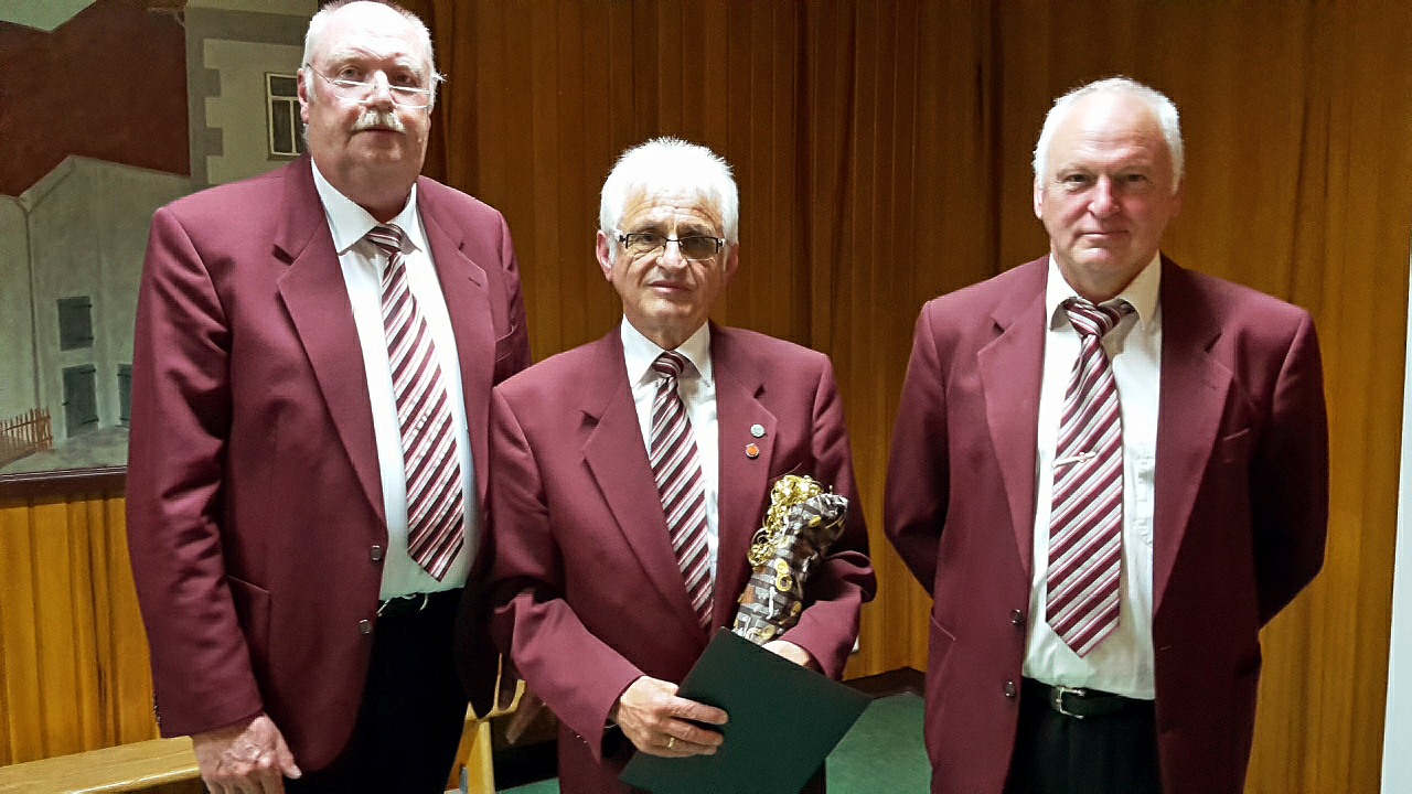 1. Vorsitzende Wilhelm Rummelsberger vom Männergesangverein „Eintracht“ Lardenbach/Klein-Eichen den langjährigen aktiven Sangesfreund Karlheinz Erdmann zum neuen Ehrenmitglied. Der bis heute aktive Sänger erhielt die Auszeichnung besonders wegen seiner seit dem 16.Januar 1988 aktiven Vereins- und Vorstandsarbeit. Seit dieser Zeit fungierte er bis zum 19. Februar 1994 als 2. Vorsitzender. Ab diesem Zeitpunkt leitete der auch in Lardenbach und in der Stadt Grünberg weitere Ehrenämter begleitende Erdmann als 1. Vorsitzender den Männergesangverein. Am 13. Februar 2015 übergab er den Vorsitz an seinen Nachfolger Rummelsberger. Dieser überreichte zusammen mit dem derzeitigen 2. Vorsitzenden Bernhard Sauer neben der entsprechenden Urkunde auch ein Präsent.