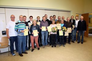 Zahlreiche Ehrungen für langjährige Mitgliedschaft gab es bei der JHV des SSV Lardenbach/Klein-Eichen durch den scheidenden Vorsitzenden Kurt Scharmann (li), dem zweiten Vorsitzenden Stefan Weeke (2.v.r) und dem neuen Vorsitzenden Karl-Ernst Lind (re) für Hans-Ferdinand Mölcher, Joachim Volp, Sabine Hartmann, Inge Lein, Anne Müller, Norbert Dittrich, Eric Hartmann, Lothar Pleik, Jens Pernak, Hans-Otto Zimmer, Edwin Scharmann, Gunter Berg und Werner Frank. In der Bildmitte die beiden neuen Ehrenmitglieder Gerda Weeke und Barbara Erdmann.
