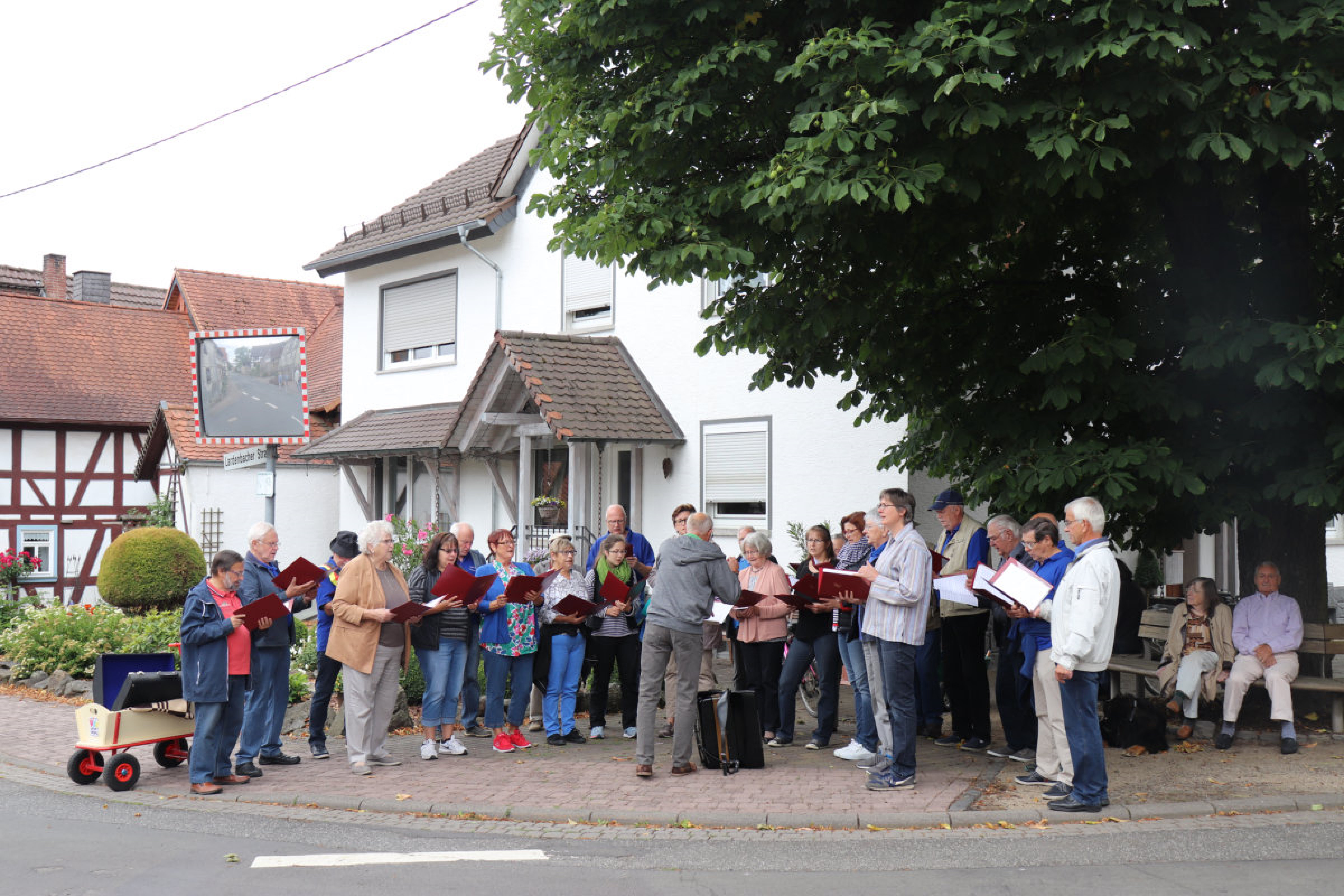 Lardenbach/Klein-Eichen(gld). Zum diesjährigen Dorfsingen mit anschließendem Backhausfest zog es wieder zahlreiche Bewohner aus Lardenbach und Klein-Eichen zum Backhaus „Am Larbach“. Zu Beginn hieß es für die Sangesfreunde jedoch in Lardenbach im Hölzchesweg und am Dorfplatz „Helgenstock“, sowie in Klein-Eichen an der Kirche die Bewohner mit einigen Liedern unter der Leitung von Chorleiter Ottmar Hasenpflug auf das Fest am Lardenbacher Backhaus einzustimmen. Dort wurde von den Sangesfreunden und weiteren Helferinnen und Helfern für die entsprechende Verköstigung mit Hackbraten und Würstchen gesorgt. Große Nachfrage herrschte zudem an dem tags zuvor gebackenen Bauernbrot und den zahlreichen und zum Teil auch im Backhaus gebackenen Hefekuchen. Mit Kaffee und verschiedenen Kaltgetränken waren die Besucher beim gemütlichen Beisammensein dann bis in die Abendstunden gut versorgt.