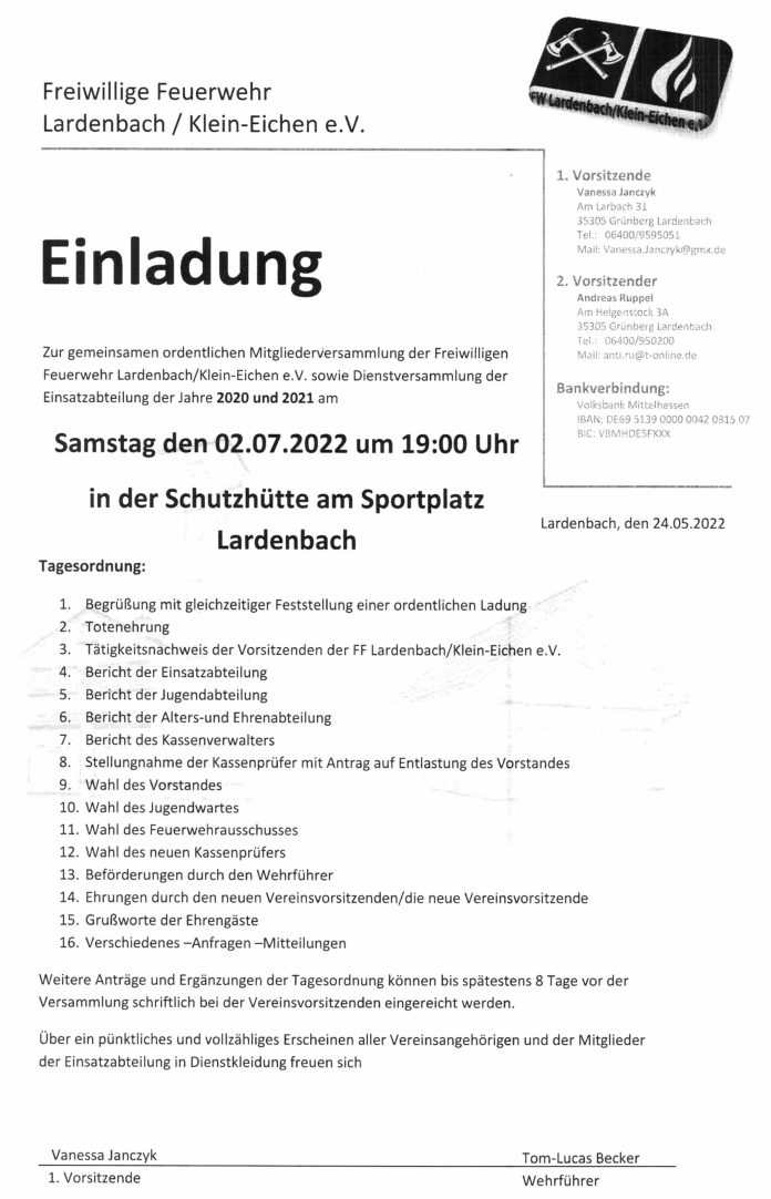 Einladung JHV Freiwillige Feuerwehr Lardenbach/Klein-Eichen