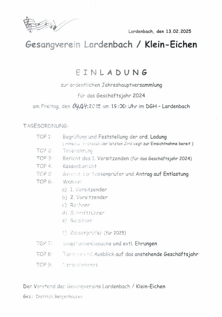 Start _Ankündigungen Einladung zur JHV beim Männergesangverein „Eintracht“ Lardenbach/Klein-Eichen Einladung zur JHV beim Männergesangverein „Eintracht“ Lardenbach/Klein-Eichen 16. Februar 2025 454