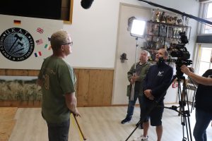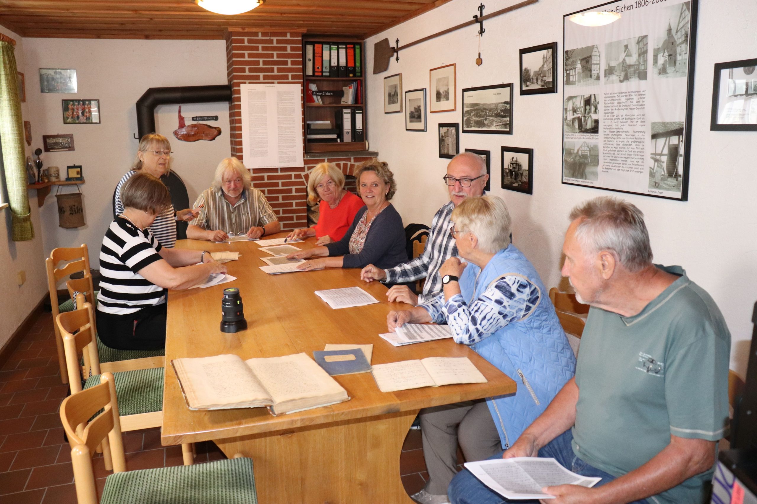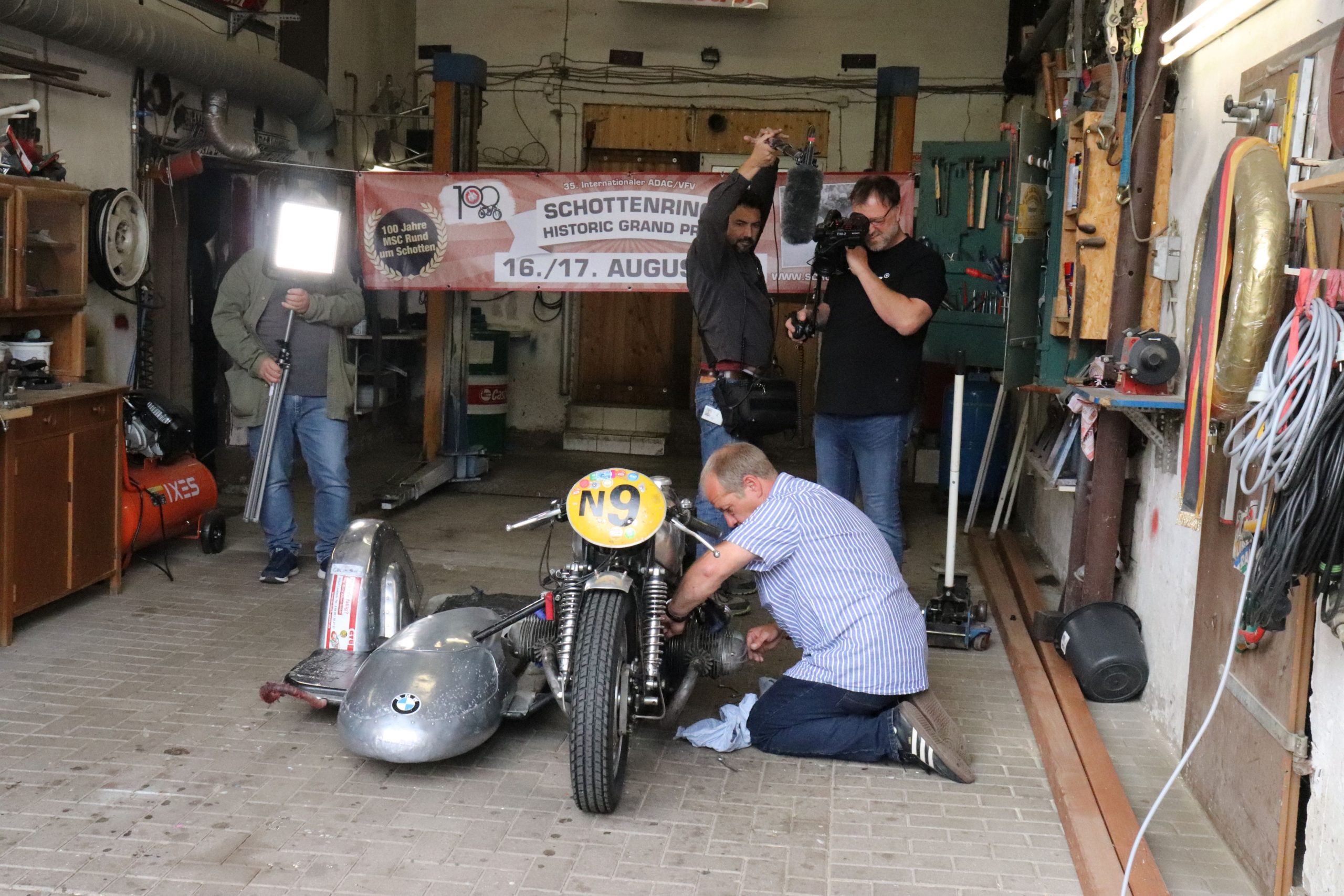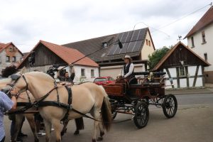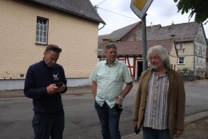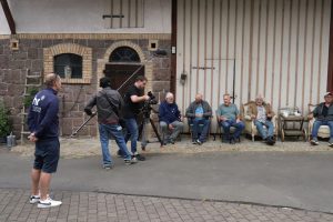 Hessenschau aus der Lostrommel „Dolles Dorf“ des Hessischen Rundfunks wurden am Abend bei einem ersten Vorgespräch die am Freitag anstehenden Dreharbeiten für die am Samstag in der Hessenschau erfolgte Ausstrahlung vorgenommen. Nach dem Empfang des hr-Teams mit Reporter Jens Kölker, Kameramann Marcus Bär, Tontechniker Clayton Smith und Beleuchter Thomas Quetsch von den weit über 50 Personen an der Klein-Eichener Kirche legten Ortsvorsteher Werner Zimmer und der erfahrene „Dolles Dorf“-Reporter Jens Kölker aus 19 vorliegenden Vorschlägen sieben typische Besonderheiten des kleinsten Grünberger Stadtteiles fest. Der Drehtag begann am Freitag in Anwesenheit des Grünberger 1. Stadtrates, Tobias Lux. Dieser vertrat ganztägig den aus seinem Urlaub auch Grüße und Glückwünsche übermittelnden Bürgermeister Marcel Schlosser. Das erste Ziel war die Klein-Eichener Hofkäserei der Eheleute Birgit Aue und Udo Senczkowski. In dem Bio-Landwirtschaftsbetrieb wurde neben dem Melken der französischen Lacaune-Milchschafe und der Käseherstellung auch der Hofladen mit dem umfangreichen Käseangebot in Augenschein genommen. Eine besondere Stätte zur Ruhe und Entspannung bot sich dem Fernsehteam dann auf dem Hof von Thomas Zabel. Mit den dort aufgestellten bequemen Sitzmöglichkeiten bietet der Rentner überwiegend den älteren zumeist auch grauhaarigen männlichen Dorfbewohnern die Möglichkeit bei einem erfrischenden Getränk in gemütlicher Runde alle Dorfneuigkeiten zu erfahren und auszutauschen. Einen außergewöhnlichen Eindruck bot die Motorrad- und Fahrzeug-Präsentation in der Rallye-Scheune. Deren Besitzer und überzeugender „Motorradschrauber“ Jens Daniel zeigte als besondere Attraktion das von Bernd Albert und ihm gefahrene Zweiergespann. Beide konnten mit diesem mehrere deutsche Meisterschaften erringen. An das eigene aufregende Fahrerlebnis auf dieser BMW-Maschine erinnerte sich Reporter Jens Kölker aus einer vor Jahren selbst mitgemachten Fahrt mit Bernd Albert auf dem Schottenring. Eine große Begeisterung gab es beim Fernsehreporter beim Abstecher beim Axtwerf-Weltmeister Berend Repp. Der den Altmühltaler Axtwerfern angehörende zweifache Weltmeister zeigte im Beisein seiner Sportkollegen Martin Berg und Wolfgang Bender neben der Wurftechnik sein überzeugendes Können. In dessen eigener Sport- und Trainingsstätte versuchte Kölker sich dann auch selbst erfolgreich beim Werfen der Doppelaxt. Einer besonderen Aufgabe widmet sich die Kurrentgruppe. Die von Pfarrerin Cordula Michaelsen ins Leben gerufene Vereinigung befasst sich mit der nicht so einfachen Übersetzung von Dokumenten mit alten Schriftarten. Dabei ist nach Aussage des Gruppenmitgliedes Annette Döpfer das Erkunden und die Erinnerung an die Vergangenheit ein gewünschter Effekt. Durch diesen komme auch die eine oder andere frühere familiäre Verbindung innerhalb des Dorfes wieder zum Vorschein. Für die Fernsehaufnahme wurden unter der gegenseitigen Leseunterstützung von den weiteren Gruppenmitgliedern Werner Zimmer, Ursula Schombert, Ingrid Daniel, Inge Lein, Norbert Dittrich und Manfred Matras mit „Kölner Schnitzel“ und „Kalbskopf“ zwei alte Kochrezepte übersetzt. Für einen Einblick in die Straßen und die Ortslage ließ das Fernsehteam zusätzlich eine Drohnenkamera aufsteigen. Die Ansicht innerhalb des Ortskerns mit Kirche und verschiedenen Fachwerkhäusern vermittelte zudem die Fahrt mit der von zwei Norwegerpferden gezogenen Kutsche von Simone Faust. Die von Günter Krchov unterstützte Pferdeliebhaberin und Kutscherin erfreut mit ihren Kutschfahrten auch bei besonderen Anlässen ihre Fahrgäste. Ihrer Aussage nach gehören Pferde auf das Land und vervollständigen ein intaktes Dorfleben. Der offizielle Dreh-Abschluss fand dann mit einem großen kostenfreien „Dorfdinner“ auf dem Anwesen der Familie Zabel statt. Organisiert hatte der auch von Jens Kölker befragte Andreas Döring vom Klein-Eichener Verein neben dem Grillen von Steaks und Würstchen auch die zur Verfügung stehenden Kaltgetränke. Weiterhin konnten die von zahlreichen Dorfbewohnern zubereiteten Speisen genossen werden. Abnehmer fanden zudem Kaffee und die leckeren Kuchen. Ortsvorsteher Werner Zimmer sprach abschließend neben allen Unterstützern auch dem hr-Team seinen Dank aus. Reporter Jens Kölker fand vor seiner Abreise nach Frankfurt ebenfalls Anerkennung und lobenswerte Worte für die angenehme Mitarbeit bei den Dreharbeiten. Die meisten Dorfbewohner nutzten bei herrlichem Sommerwetter noch die Zeit um bis in die Abendstunden ausgiebig ihr „Dolles Dorf“ zu feiern und sich dabei schon auf den fünfminütigen Beitrag in der Hessenschau am Samstag zu freuen.
