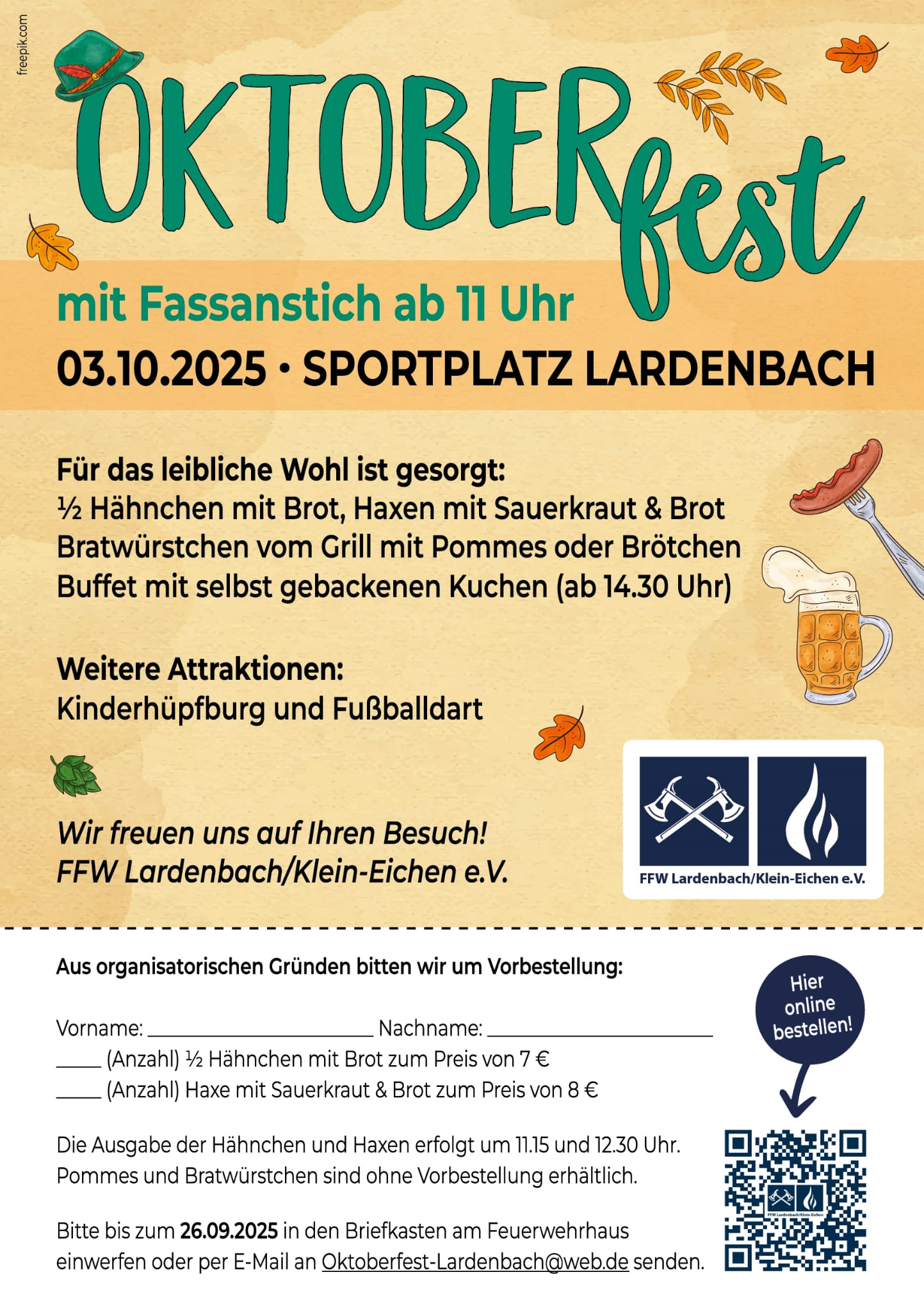 Start _Ankündigungen Einladung zum 17. Oktoberfest in Lardenbach Einladung zum 17. Oktoberfest in Lardenbach 3. September 2025 187 Essenvorbestellung bis zum 26. September 2025 vornehmen