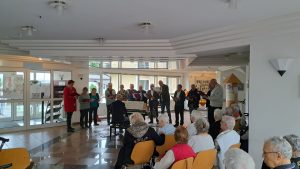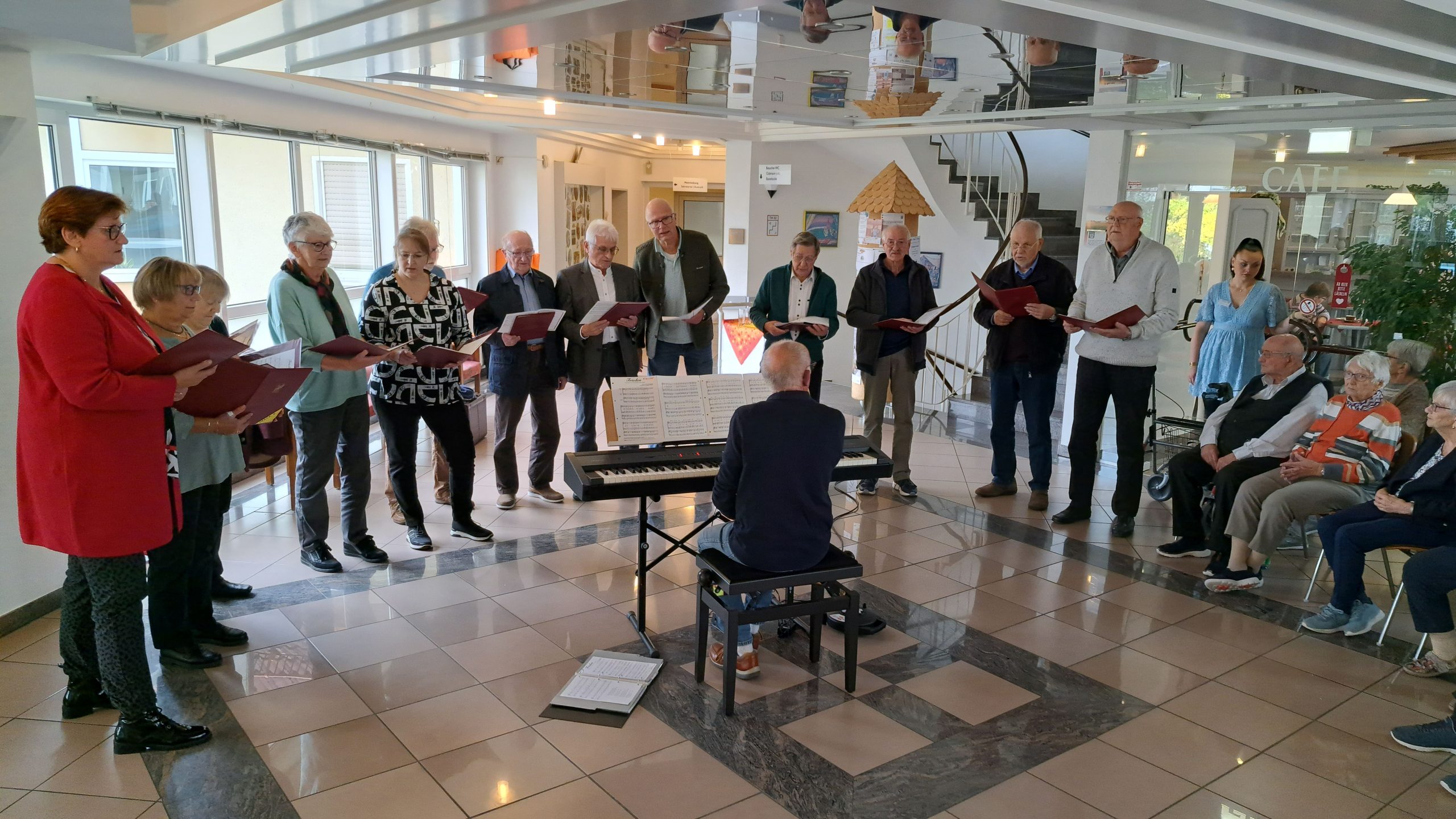 Mit Chören zum Mitsingen und Mitklatschen erfreute der gemischter Chor des Männergesangvereins „Eintracht“ Lardenbach/Klein-Eichen die Bewohner des Seniorenheims „Am grünen Berg“ in Grünberg. Der unter der Leitung von Ottmar Hasenpflug stehende Chor führte mit diesem Auftritt eine über Jahrzehnte und leider durch die Coronazeit unterbrochene Tradition fort. Diese von den Heimbewohnern immer sehnlichst erwarteten kleinen Konzerte standen einst stets am Karfreitag auf dem Programm. Bei der nunmehr erfolgten Chorpräsentation erfreuten die Chormitglieder mit dem von Margot Hellwig interpretierten volkstümlichen Lied „Frieden“ und dem von Hanne Halle gesungenen Song „Für Alle“. Bei den weiteren Chören „Ich war noch niemals in New York“ und dem Hit von Doris Day „Que sera, sera (Was kann schöner sein)“ wurde von den Anwesenden kräftig mitgesungen und mitgeklatscht. Als Zugabe brachten die am Ende mit viel Beifall bedachten Sängerinnen und Sänger noch den bekannten Oldie „Capri-Fischer“ zu Gehör. Ergänzt wurden die musikalischen Darbietungen durch drei von Karlheinz Erdmann vorgetragene Herbstgedichte. Dieser hatte zuvor auch die Begrüßungs- und späteren Abschiedsworte gesprochen, wobei es auch das Versprechen für einen weiteren Auftritt im nächsten Jahr gab.