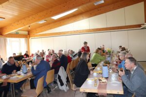 Bis zum Schluss wurden bei ihrem monatlichen Treffen die Seniorinnen und Senioren aus Lardenbach und Klein-Eichen in Spannung gehalten, was die als Thema bei der Einladung angegebene Zahl „11188“ zu bedeuten hatte. So gab es zunächst nach der Begrüßung der Anwesenden eine von Karl-Heinz Hollederer gedrehte Filmaufnahme von der am 26. Juli 1995 in Lardenbach und Klein-Eichen stattfindenden Sommertour von hr4-Radio Lahn. Die einstündige Live-Sendung unter dem Titel „Grenzgeschichten aus dem Herzen Hessens“ wurde von dem beide Stadtteile trennenden und im Volksmund als „Grenzgraben“ bezeichneten „Lardenbach“ gesendet. Neben der Vorstellung von dörflichen Besonderheiten mit einem Gespräch mit den Ortsvorstehern Karlheinz Erdmann und Manfred Daniel, der Vorstellung der beiden Ortsdiener Berta Funk und Hans-Ferdinand Mölcher, dem von Karin Kratz als „Hessenpizza“ bezeichneten Schmierschelkuchen und dem von Werner Zimmer vertretenen „Klein-Eichener Arbeitskreis zur Erhaltung der Lebensfreude“ (K.A.R.L.) äußerten sich in einem Interview einige Bürger zum Dorfleben. Für die musikalische Unterhaltung der mehrere hundert Besucher hatte der Hessischer Rundfunk den Schlagerstar Bernd Clüver und den Sänger und Parodisten Michael Birkenfeld verpflichtet. Ein weiterer musikalischer Höhepunkt war der Auftritt der Seenbachtaler Jagdhornbläser unter der Leitung von Otto Biedenkopf. Moderiert wurde die damalige Sendung von Marina Gust und Werner Lohr. Wie sich herausstellte, konnten sich viele der Senioren beim aktuellen Treffen nicht mehr so genau an die Einzelheiten der vor nahezu 31 Jahren ausgestrahlten Rundfunksendung erinnern. Dies dürfte auch an den zwischen der Live-Sendung und dem neuerlichen Seniorentreff zurückzuführenden 11188 Tagen liegen. Diese Zahl wurde daher für das Treffen im Monat März als geheimnisvolles Einladungsthema gewählt. Als besondere Überraschungsgäste konnten die auch in Erinnerung schwelgenden Senioren die damalige Moderatorin Marina Gust und den heutigen Grünberger Ehrenbürgermeister Siegbert Damaschke begrüßen. Die spätere langjährige hr4-Studioleiterin in Gießen erläuterte nach der Filmaufführung in einem Zwiegespräch mit Karl-Ernst Lind die Entstehung, die Vorbereitung und das Erlebte während der Veranstaltung. Dabei fehlte auch nicht die eine oder andere Anekdote. Erwähnung fand die im Vorfeld schon feststehende Tatsache, dass es mit Bürgermeister Siegbert Damaschke als Politiker kein Interview geben sollte und dadurch es für dessen Kommen daher eine größere Überzeugungskraft bedurfte. Auch die während der Liveübertragung von dem damaligen Wetzlarer Studioleiter Knut Kuckel gestellte Frage nach dem Abstellen des landwirtschaftlichen Geruchs von Mist und Silage kam zum Gespräch. Ein Thema waren die nicht beseitigten Spinnweben in der Scheune von Richard Fitzthum, wo nach der Sendung vom hr4-Team und den fleißigen Helfern der eigens im Backhaus gebackene Lardenbacher Schmierschelkuchen verzehrt wurde. Diesen gab es diesmal ebenso neben Hefekuchen und Kaffee auch für alle Anwesenden beim Seniorentreff zu genießen.