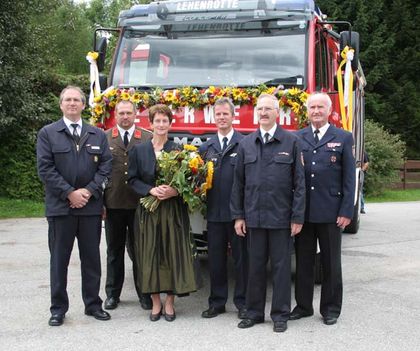 Dort genoss man bei schönem Wetter in 1270 Meter Höhe neben der herrlichen Aussicht auch eine entsprechende Stärkung. Am Abend stand dann das gemeinsame Feiern an. Mit der Frauentrio „Hiatamadln“ und einer weiteren Disco-Party gab es in den Räumlichkeiten im Gerätehaus Lehenrotte eine entsprechende Stimmung. Der Sonntag stand dann im Zeichen des neuen Tanklöschfahrzeuges. Einer Feldmesse im Gerätehaus und der anschließenden Segnung des TLFA-4000 folgte im Anschluss vor dem Gerätehaus der Festakt mit zahlreichen Ehrengästen aus der Politik und dem Feuerwehrwesen.
