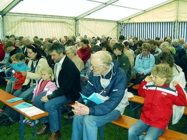 Trotz des regnerischen Wetters fanden sich am Himmelfahrtstag zwischen zweihundert und dreihundert Gläubige zum Gottesdienst in Lardenbach ein. Das von der Einsatzabteilung der Feuerwehr Lardenbach/Klein-Eichen aufgestellte Zelt bot den überwiegend aus dem Dekanat Grünberg Ost kommenden „Kirchgängern“ entsprechenden Schutz. In diesem Jahr gestaltete den schon über mehrere Jahrzehnte durchgeführten Gottesdienst Pfarrerin Renate Dienst aus Merlau und Pfarrer Ulf Häbel aus Freienseen.