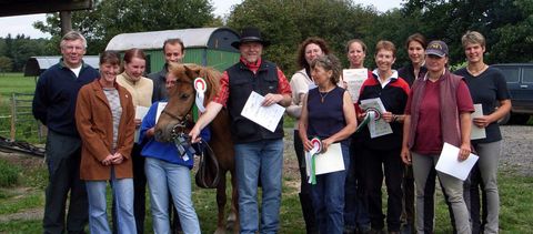 Grundlage für das Basiswissen waren Fragen rund ums Satteln und Trensen. Weitere Aufgaben für die jüngsten Teilnehmer waren das Führen und die Nennung von Körperteilen der Pferde. Zu den Aufgaben bei der Führprüfung gehörten das Pony durch einen Parcour zu führen, einen Slalom mit Pylonen zu absolvieren und mit dem Pferd über Stangen zu gehen. Weiterhin standen das Traben und das Rückwärtsrichten auf dem Programm. Vielseitig waren die Aufgaben für die Teilnehmer bei der Schnitzeljagd. So musste eine markierte Strecke gefunden werden. Zudem galt es das Beantworten von Fragen, das Gewichtschätzen von Ponys und Strohballen, das Erkennen von Futtersorten und das Vorlegen von verschiedenen Naturgegenständen erfolgreich zu absolvieren. Viel Freude bereitete den kleinen Pferdefreunden die Reiterspiele. Für die im Team angetretenen Kinder hieß es dabei in kürzester Zeit Wasser zu transportieren, einen Slalom zu reiten, ein Pony zu bandagieren. Unter den Augen der beiden Richter Kyra Heinrich und Rainer Euler gab es eine „geführte“ und eine „gerittene“ Gelassenheitsprüfung für Reiter und Pferd. In fünf Minuten wurde bei zehn verschiedenen Aufgaben die Grundausbildung und die Gelassenheit des Pferdes festgestellt. Trotz unvorhergesehener Vorkommnisse muss das Pferd dabei aber immer den Hilfen der Führperson oder des Reiters folgen. Schwerpunkte der Prüfung waren u. a. das Bewegen in Schritt und Trab und das überschreiten einer kleinen Brücke, sowie auf Kommando stillstehen. Am Ende konnten sich die Prüflinge bei der „geführten“ Prüfung über drei Mal Drei, drei Mal Zwei und zwei Mal Eins als Wertnote freuen. Bei der gerittenen Prüfung gab es jeweils einmal die Note Eins, Zwei und Drei. Erfreut über das gute Abschneiden und über das Erreichen des Ausbildungszieles zeigte sich auch besonders Ausbilderin Heike Zwick.