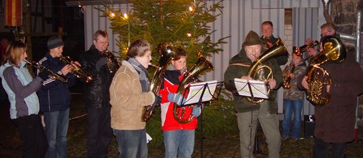 Der Kindergarten wurde dabei durch die beiden Hobbyisten Wilfried Berg und Günter Felsing unterstützt, die eine stattliche Zahl von eigens angefertigten Holz- und Bastelarbeiten spendeten. Großes Interesse bestand auch an den von den Mitgliedern der Patchworkgruppe erstellten Produkten. Für die gute Versorgung der Gäste sorgten der Männergesangverein die Jugendfeuerwehr mit Creps, sowie der Spiel- und Sportverein Lardenbach/Klein-Eichen, der Obstbau- und Kelterverein Lardenbach/Klein-Eichen und die Freiwillige Feuerwehr Lardenbach mit diversen Getränken. Zur Freude der nicht nur heimischen Kinder hatten die Organisatoren auch für das Erscheinen des Nikolauses gesorgt. Dieser überzeugte sich von den braven Kindern und überreichte vor seiner Weiterreise allen Mädchen und Jungen ein Geschenk. Zur Unterhaltung und zur Einstimmung auf das bevorstehende Weihnachtsfest trugen die Seenbachtaler Jagdhornbläser bei. Die zehn unter der Leitung von Otto Biedenkopf stehenden Bläser ließen dabei bekannte Advents- und Weihnachtslieder erklingen. Mit drei Weihnachtschören konnte auch der Männergesangverein Eine weitere Überraschung gab es für die jüngsten Adventstreff-Besucher durch Ernst Volp. Der Klein-Eichener Hobbyfilmer führte den interessierten Kindern einen Zeichentrickfilm vor. Durch die vorbildliche Unterstützung des Adventstreff durch Vereine und Sponsoren kann sich somit wieder die heimische Jugend freuen. Denn der Erlös der Veranstaltung soll traditionsgemäß der Nachwuchsarbeit in den örtlichen Vereinen zu Gute kommen.