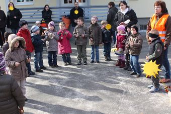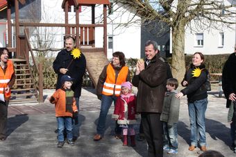 Denn auch sie verspüren beim Scheinen der Sonne den natürlichen Einfluss auf die Gemütslage. Der abwechslungsreiche Nachmittag begann mit einem von den Erzieherinnen Ursula Seipp, Edith Hammer, Liane Forgel und Peppler begleiteten Dorfrundgang. An vier Stellen wurden von den mit selbstgebastelten Sonnen ausgestatteten Mädchen und Jungen instrumental unterstützte Frühlingslieder vorgetragen. Am Kindergarten sollte dann der von den Kindern mit Spannung erwartete Auftritt von Bürgermeister Frank Ide erfolgen. Schon im Vorfeld hatten sich die Kids Gedanken über die Taufe ihres Kindergartens gemacht. Dabei gab es auch die Frage, ob der Bürgermeister auf Anhieb die gefüllte Wasserbombe an der Gebäudeaußenwand zum Zerbersten bringt. Nach seinen Gruß- und Dankesworten erledigte zur Freude Aller das Stadtoberhaupt die gestellte Aufgabe gekonnt. Im Anschluss an die gelungene Taufe und der Bitte von der KIGA-Leiterin Ursula Seipp, das Anbringen eines vorgesehenen neuen Namensschildes zu unterstützen, hieß es dann für alle Anwesenden sich an der von einigen Müttern und Omas gespendeten Kuchen- und Kaffeetafel zu stärken.