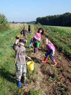 Zudem gab es auch zahlreiche Informationen über die zahlreich angebauten Gemüsesorten. Nach dem Ausroden der Knollen durch Thorsten Diehl hieß es nun für die Kids die Kartoffeln aufzulesen. Spannend war dabei für jeden schnellstens die dickste Kartoffel zu finden. Denn diese sollte am Ende der Kartoffelkönig sein. Zur Belohnung durften die mächtigsten Erdäpfel mit nach Hause genommen werden. In einer zwischenzeitlichen Pause verzehrten die Mädchen und Jungen zur Stärkung Pellkartoffeln und Quark und sangen auch zum Dank ein Lied. Unser Bild zeigt die fleißigen Helfer bei der Ernte