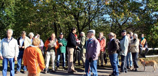 Die am Sonntag teilnehmenden und zum Teil auch von weither angereisten Interessierten hatten, bedingt auch durch das herrliche Herbstwetter, ein besonders Erlebnis. Nach dem Streckeneinstieg in Freienseen und dem Zusehen beim Freienseener Drachensteiger-Event wurden die Gruben und Abbaugebiete „Schöne Aussicht“ „Maximus Süd“, „Maximus Nord“, die „Grube Hoffnung“, die „Grube Weickartshain“, die Erzaufbereitungsstätte Weickartshain, die Grube „Deutschland“ und die Grube „Neugrünende Hoffnung“ erwandert. Ausführliche Erläuterungen gaben dabei mit ihrem umfangreichen Fachwissen die Mitinitiatoren des Erzweges, Karl Rudi (Ulrichstein) und Helmut Felsing (Lardenbach). Verwiesen wurde ebenso auch auf die Internetseite www.erzwanderweg.de auf der die einzelnen Stationen des jederzeit ohne Führung zu erwandernden Rundwanderweges mit gleich mehreren Einstiegsmöglichkeiten in Weickartshain Lardenbach und Freienseen ausführlich dargestellt werden. Unser Bild zeigt die Wandergruppe an einer der aufgestellten Informationstafeln, wo es durch Karl Rudi und Helmut Felsing weitere detaillierte Informationen gab