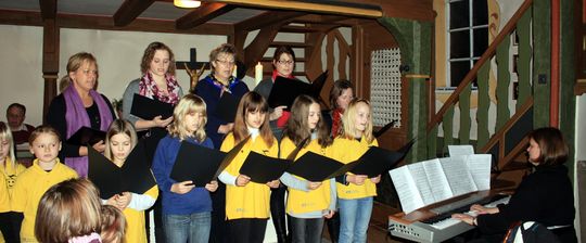 Musikalisch folgten zunächst die „Minis“ der Sing-, Spiel- und Spaßtruppe des Männergesangvereins „Eintracht Lardenbach/Klein-Eichen. Diese trugen zuerst das Lied “Lasst uns miteinander“ und dann zusammen mit den „Maxis“ Feliz navidat“ vor. Als „Extra-Chor“ präsentierten sich danach einige junge Nachwuchssängerinnen auf Spanisch mit „Toda la tierra“. Die Geschichte um die Bedeutung der „vier Kerzen vom Adventskranz“ erzählte Willi Rummelsberger. Mit den Chören „Trommellied“ und „Engel haben Himmelslieder“ erfolgte die weihnachtliche Einstimmung durch die Männerstimmen. Geleitet von Minette Kraft sang der Männerchor am Ende noch die Lieder „Weihnachtsglocken“ und „Fröhliche Weihnacht überall“. Einen Auftritt hatte auch die Gruppe „Große Mädels-Kleine Mädels“ mit Thank you for the music“. Zusammen mit einem Projektchor und den „Maxis“ sangen sie anschließend noch das von John Lennon und Yoko Ono stammende „Happy X-Mas“. Begleitet von zwei Flöten intonierten die „Maxis“ das Lied „Es ist ein Ros entsprungen“.
