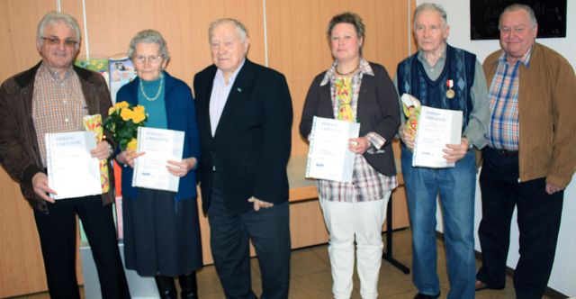 Karlheinz Erdmann, Elli Ruschig, Margaret Trüller und Karl-Heinz Rühl wurden für ihre Verdienste und Mitgliedschaft von Edmund Glapa (3. V. l.) und Heinz Launspach (re) ausgezeichnet
