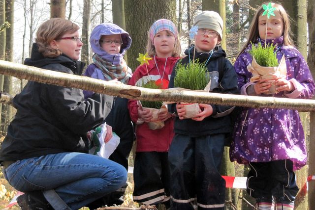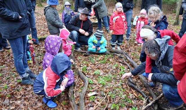 Der mit der Bewilligung von Jörn Zöller und des Jagdpächters Helmut Nickel eingerichtete Waldplatz soll den Kindern die Möglichkeit zum besseren Kennenlernen der Natur und des Lebensraumes Wald geben. Zu Beginn hieß es dabei für die Kinder Naturmaterialien zu sammeln und diese dann später zu einem Naturmandala zu legen. Zudem mussten Eltern und Kids noch einen Waldquiz-Fragebogen ausfüllen, bei dem am Ende per Los die drei Gewinner-Familien Berg, Schmidt und Scharmann ermittelt wurden. Versorgt wurden die von den Erzieherinnen Ursula Seipp, Liane Forgel, Nicole Schwandner-Rausch und Brigitte Hoffmann betreuten Kinder und Eltern mit Würstchen und geschnitten Äpfeln. Am von den Kids umkreisten Hochsitz erklang dann zum Abschied noch ein gemeinsam gesungenes Lied.