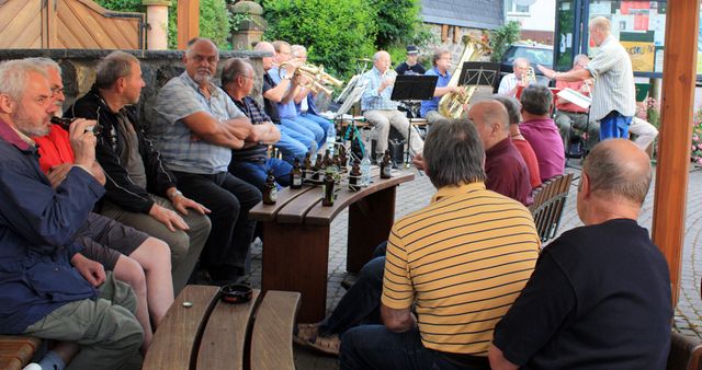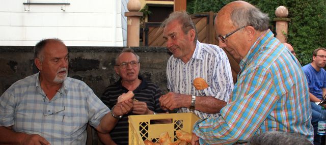 Eine etwas andere Übungsstunde absolvierten kürzlich die Mitglieder des Posaunenchores Untere Vogelsberg. Unter der Leitung von Ulrich Heitmann probten unter freiem Himmel elf Musiker öffentlich auf dem Dorfplatz am Helgenstock in Lardenbach mit ihren Blasinstrumenten und einem Schlagzeug. So erklangen in den Abendstunden zahlreiche besinnliche Choräle und weltliche Melodien. Angelockt wurden dadurch etliche Bewohner aus Lardenbach und Klein-Eichen. Diese belohnten die Musiker dann auch mit reichlichem Applaus. Für einen besonderen Leckerbissen sorgte der Lardenbacher Metzgermeister Hans-Georg Kielbassa. Er spendete den Musikern und den Zuhörern in Form von Fleischkäse und Fleischwurst einen kleinen Imbiss. Die dazu notwendigen Brötchen stellte der im Posaunenchor selbst aktive Sellnröder Bäckermeister Jörg Halbig kostenfrei zur Verfügung. Auf besonderen Wunsch und zur Freude der Anwesenden gab dieser als Gesangssolist am Ende auch noch gekonnt das Lied vom „Pferdehalfter an der Wand“ zum Besten.