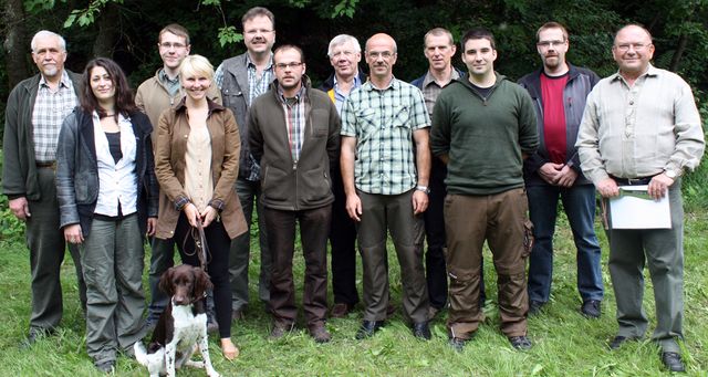 Von den vierzehn neuen Jungjägern der Jägervereinigung Oberhessen erhielten am vergangenen Sonntag elf den traditionellen Jägerschlag. Im Rahmen des diesjährigen Sommerfestes an der Lardenbacher Grillhütte nahm zusammen mit dem Vorstandsmitglied Andreas Basselli Vereinsvorsitzender Helmut Nickel mit den Sprechen der Formel „Der erste Schlag soll dich zum Jäger weih`n, der zweite Schlag soll dir die Kraft verleih`n zu übern stets das Rechte, der dritte Schlag soll dich verpflichten, nie auf Jägerehre zu verzichten“ und dem gleichzeitigen dreimaligen Schlagen mit einem Waidblatt auf die Schulter des Jägers sodann die jungen Waidmänner feierlich in die Jägerschaft auf. Nickel verglich in seiner Ansprache die frühere überwiegend praxisbetonte dreijährige Lehre mit der heutigen mehrwöchentlichen Ausbildung. Bedingt durch die derzeit überwiegend theoretische Schulung forderte er von den Jungjägern sich nunmehr verstärkt dem praktischen Jagdgeschehen zu widmen. Bei dem von den Jagdhornbläsern mit verschiedenen Fanfaren und Signalen umrahmten ältesten Brauchtum wurden Jan-Michael Grundmann (Mücke-Ruppertenrod), Frank Althaus (Kestrich), Janina Schulz (Biebertal), Sebastian Trageser (Frankfurt), Reiner Euler (Buseck), Dominik Schäfer (Ortenberg), Thorsten Franz (Laubach-Gonterskirchen), Thilo Berg (Grünberg-Lardenbach), Bernd Seibert (Homberg-Schadenbach), Andreas Bräuning (Mücke-Flensungen) und Lea Antonia Schwieters (Marburg) nach ihrer bestandenen Jägerprüfung aufgenommen. Eine erfolgreiche Jägerausbildung mit den Fächern Jagdrecht, Wildtierkunde, Jagdbetrieb und Hundewesen, Wildhege und Naturschutz, sowie der Waffenkunde mit Schießprüfung und Fertigkeit beim Umgang mit der Kurzwaffe absolvierten auch die drei nicht anwesenden Jungjägerinnen Tanja Hummer (Weilburg), Karin Müller (Mücke-Sellnrod) und Yvonne Frölich (Halberstadt). Somit konnten auch bei dieser von der Jägervereinigung Oberhessen organisierten Jägerprüfung wieder alle Teilnehmer erfolgreich abschneiden und die einhundert prozentige Erfolgsquote bei der Jägerausbildung weiterhin aufrecht erhalten. Als eine besondere Abwechslung präsentierte sich ein Teil der derzeit in Ausbildung stehenden Jagdhunde. Unter der Anweisung des Ausbilders Klaus Schmidt zeigten die Hundeführer mit ihren Tieren das bisher Gelernte.