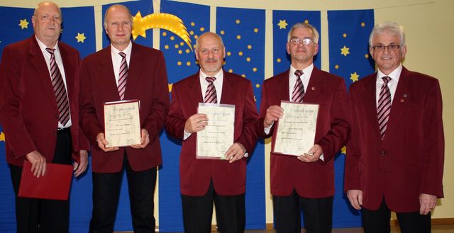 2. Vorsitzender Bernhard Sauer (li) und 1. Vorsitzender Karlheinz Erdmann (re) zeichneten die aktiven Vereinsjubilare Jürgen Hofmann, Gerhard Pernak und Ernst Paha (v.l.n.r.) aus