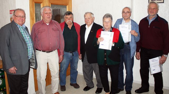 Bezirksvorsitzender Heinz Launspach (li) und Ortsverbandsvorsitzender Edmund Glapa (4. v. l.) ehrten die Mitglieder Heinz Schwanke, Eduard Schmidt, Veronika Nowey, Manfred Lind und Edwin Scharmann für 10 Jahre Mitgliedschaft (v.l. n. r.)