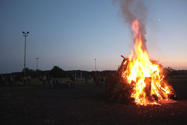 Nach dem in den letzten Jahren eher rückläufigen Besuch zog es diesmal zum Sommerfest des Obstbau- und Keltervereins Lardenbach/Klein-Eichen wieder viele Gäste auf das Sportgelände. Bei herrlichem Sommerwetter stärkten sich am vergangenen Samstag die Besucher aus beiden Grünberger Stadtteilen mit den angebotenen Steaks und Würstchen. Zudem konnte man sich mit kühlen Getränken erfrischen. Neben den geselligen Gesprächen stand besonders für die jüngeren Besucher das bei Einbruch der Dunkelheit angezündete Sonnenwendfeuer. Am Ende versammelten sich nicht nur die Kinder um die den Abendhimmel erhellende Feuerstelle. Unser Bild zeigt das Sonnenwendfeuer und im Hintergrund einige der zahlreichen Gäste.
