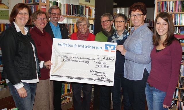 Erfreut zeigten sich Grünbergs Bürgermeister Frank Ide und Johanna Lang von der Stadtverwaltung Grünberg über die doch überaus hohe Spende von 1.635 Euro an die Bücherei der Stadt Grünberg. Der Betrag stammte aus dem Erlös einer Tombola. Diese wurde von den Quiltfreunden Lardenbach/Klein-Eichen innerhalb ihrer vom 29. Oktober bis 01. November 2015 andauernden Ausstellung im Grünberger Barfüßerkloster durchgeführt. Bei der sehr gut besuchten Veranstaltung mit vielen sehenswerten Patchworkarbeiten der zirka 15 Gruppenmitglieder wurde als Hauptpreis ein von Annelie Elsner aus Butzbach gewonnener und von allen Gruppenmitgliedern gemeinsam erstellten Sternenquilt verlost.